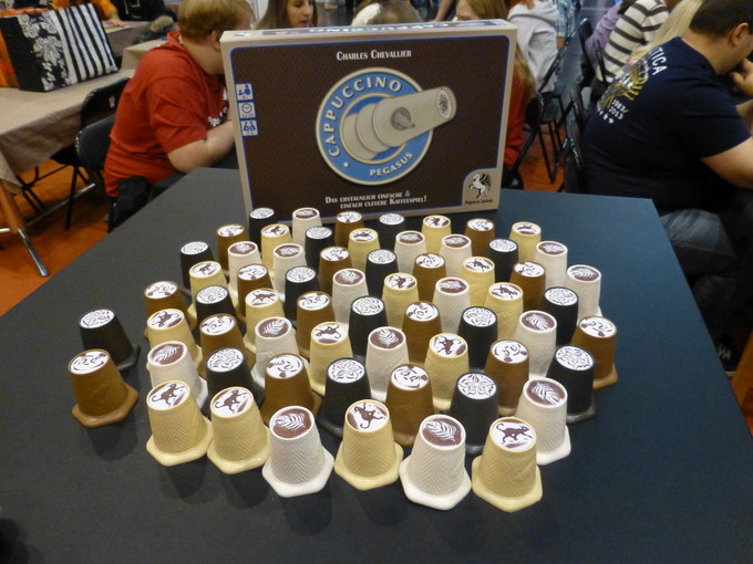 Cappuccino features 64 beautiful plastic coffee cups in four different colors, with each player owning one color. At the start of the game, place all the cups face down on the table, shuffle them, then group them together. On a turn, a player can capture a stack that's adjacent to one of his own stacks as long as his stack is the same height as or taller than the adjacent stack. As long as a player's color stays on top of the stack, he controls that stack. If one or more stacks are isolated from the main group and all of these stacks are controlled by the same player, he can take possession of them, removing them from the game. When all the cups have been captured, players stack all of the cups they captured and whoever has the highest stack wins.