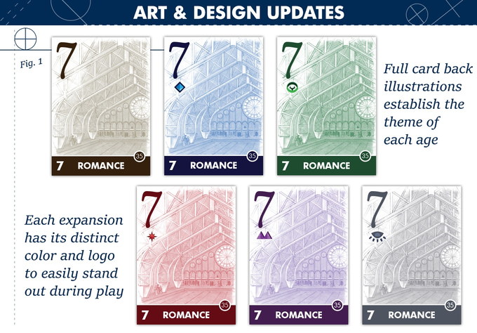 As you can see, in addition to design tweaks to cards, we've also decided to spruce up the cards with fully illustrated backs which establish the theme of each age, as well as reconfiguring the important icons and info to make gameplay easier and more intuitive when all the decks are laid out in front of you.
