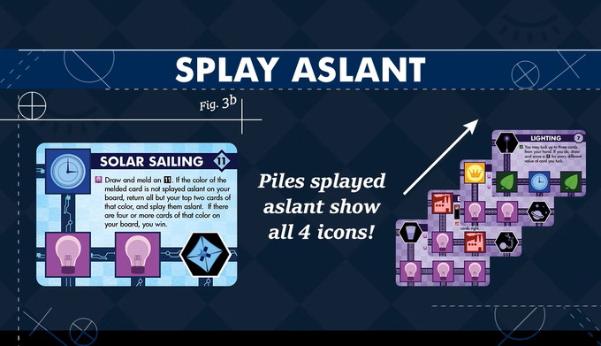 As you play new cards, you'll cover up your old innovations. You'll only ever have five cards available to activate, but your older cards still quite valuable because of splaying. Some effects will allow you to splay a pile in a specified direction, revealing icons on all the cards you covered up. This is crucial for keeping up with your opponents' efforts to share your effects, and to resist Demands.