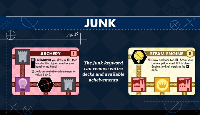 We've added the new keyword junk to replace remove, which is used to send cards out of the game entirely. Some cards will even allow you to junk entire ages or achievements, letting you skip ahead, catch up, or reach the higher ages!