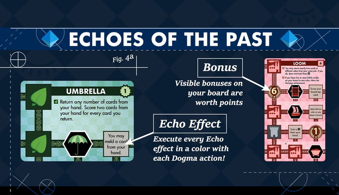 Echoes of the Past adds Echo Effects, which are activated when visible, and also the Foreshadow mechanic, which lets you store cards from future ages. You'll be able to promote them to your board once you get to that age, and take a free Dogma Action! Bonuses, which give extra points when visible, are part of the Echoes, Figures, and Cities. expansions.