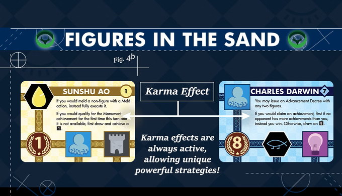 Figures in the Sand brings innovators from the ages into the game. Each Figure has a Karma Effect, which can't be activated with a Dogma Action. Instead, it has a constant impact on the game. You can only have one active Figure at a time - who will you choose to lead your civilization's innovating?
