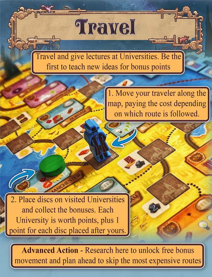 Over the course of the game (18 turns), players take dice from the Workshop Rondel, Give Lectures in Prestigious Institutions, Travel the UK, and Complete Assignments from Ada to gather Prestige Points.