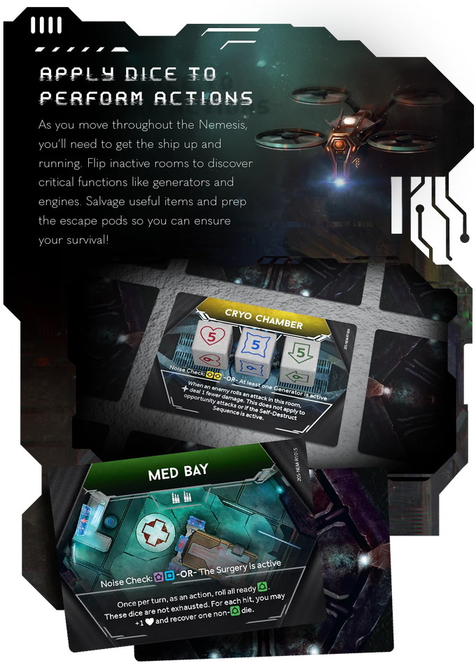 Rooms start inactive at the beginning of the game, so you’ll need to get the ship up and running again to have any chance of escaping. Get the generators online and engines running, and prep the escape pods! The ship is full of useful items. Salvage what military or technical tools you can and utilize them wisely. Every player has their own objectives. Their choices might even require you not to make it off the ship alive. Focus on your survival and make sure you’re in one of those escape pods!