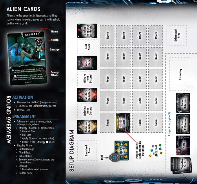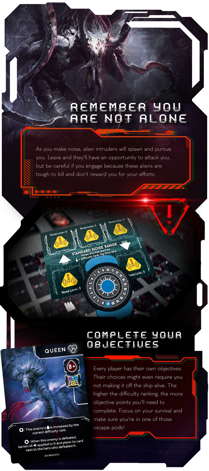 In 20 Strong: Nemesis, you desperately want to reach Earth in one piece, but it won’t be easy. As you explore the ship and evade the intruders, you may encounter crewmates willing to betray you. Roll dice to move throughout the ship. Discover critical functions like generators, engines, and escape pods. The longer you take, the more noise you’ll make.