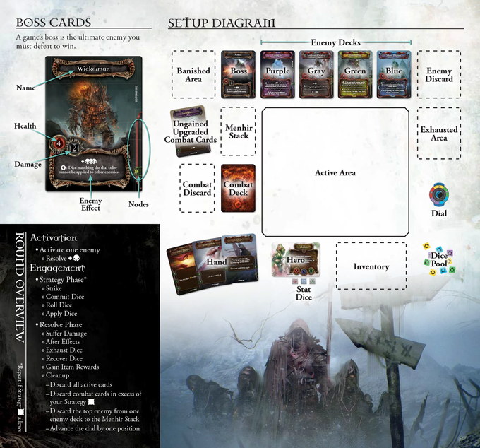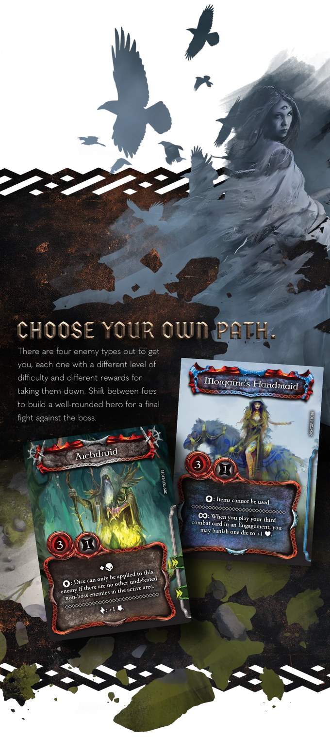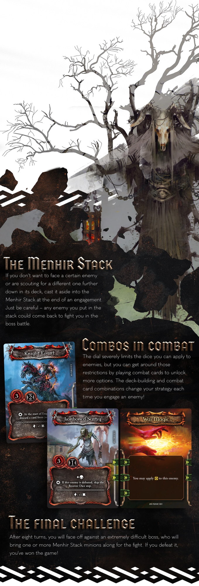 The deck-building and combat card combinations change your strategy each time you engage an enemy! If you don’t want to face a certain enemy or are scouting for a different one further down in its deck, cast it aside into the Menhir Stack at the end of an engagement. After eight turns, you will face off against an extremely difficult boss, who will bring one or more Menhir Stack minions along for the fight. If you defeat it, you’ve won the game!