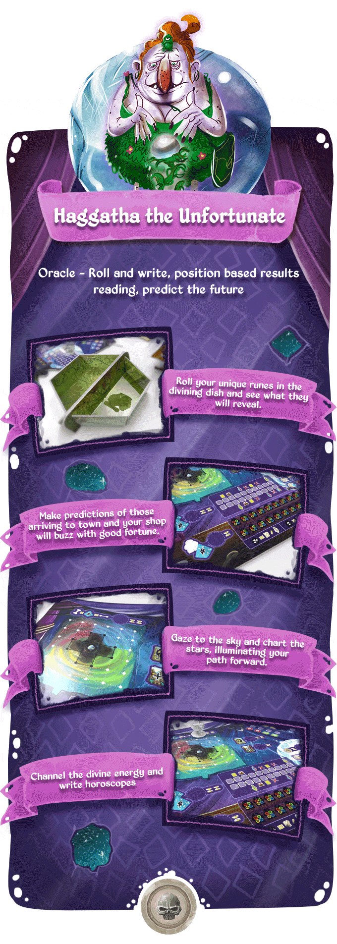 As Haggatha the Oracle, you deal in fortunes for the unfortunate. Read the stars, divine the future, and twist the fates in your attempts to part folks from their precious gold. Weary adventurers visit your shop in search of hope and guidance. You offer this through lucky charms and horoscopes, but sometimes you need to do a little voodoo, too. Just be careful not to let your dark dabblings—or dirty dishes—scare away too many honest customers