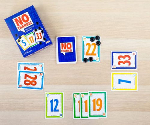 No Thanks! is a card game designed to be as simple as it is engaging.The rules are simple. Each turn, players have two options: play one of their chips to avoid picking up the current face-up card pick up the face-up card (along with any chips that have already been played on that card) and turn over the next card However, the choices aren't so easy...