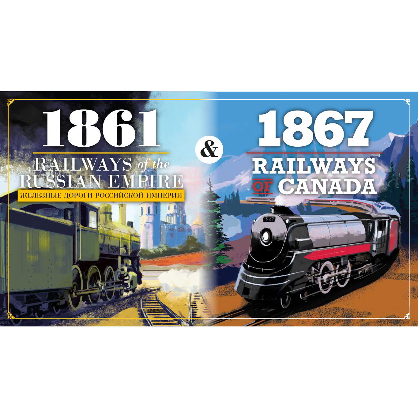 In 2005, Ian D. Wilson released 1861: Railways of the Russian Empire inspired by the railway development of Russia. In 2015, he released 1867: Railways of Canada, which is a standalone game that uses 1861's core rules on a different map with a handful of variations to gameplay. Both are classic examples of the versatile 18xx system of train games. They are straightforward enough to be your 1st 18xx game while still offering the depth you want in your 100th game.