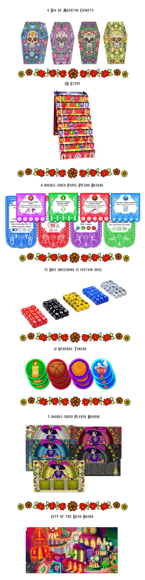 To do this players will choose, maniplulate and roll caskets containing dice representing souls. They will have Candles, Incense, Marigolds and the Bread of the Dead to help them, but need to hope for a little luck.