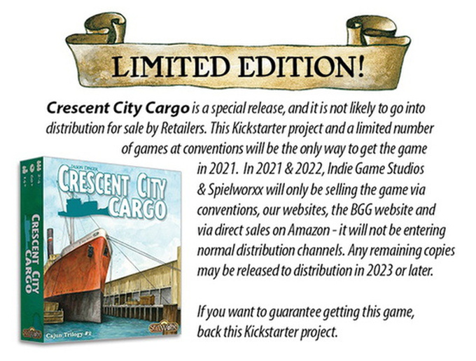 Come on down to the Mississippi River and start your lucrative logistics business in the most important hub of commerce. In Crescent City Cargo, players take on the roll of competing logistics companies vying to fulfill lucrative contracts with domestic railways, foreign cargo ships, and future speculated trade opportunities through shipping containers waiting to be loaded at the dock. Players receive goods from warehouses and use them to improve the state of their company or earn valuable capital that will serve to establish their dominance in the local trade market.