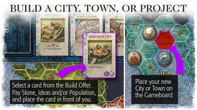 • Found a New City or Town, or Build a Project (select a card from the Build Offer and pay the cost in stone, ideas, and population)
