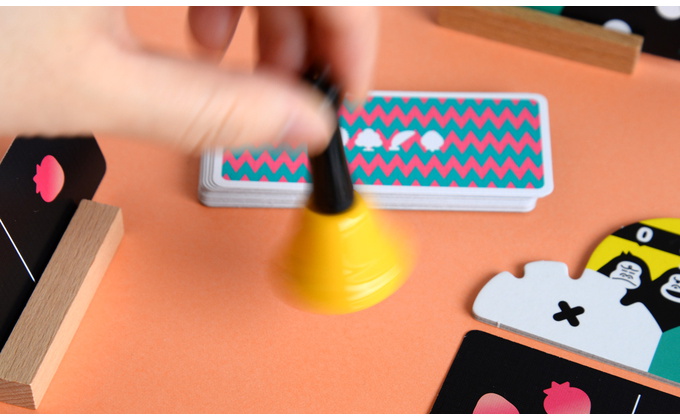 Packed in the usual, compact Oink Games box comes seven wooden card stands, a small handbell, and other eye-catching components. For 2-7 players, this is a game that's a lot of fun even for small children.