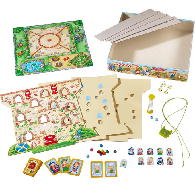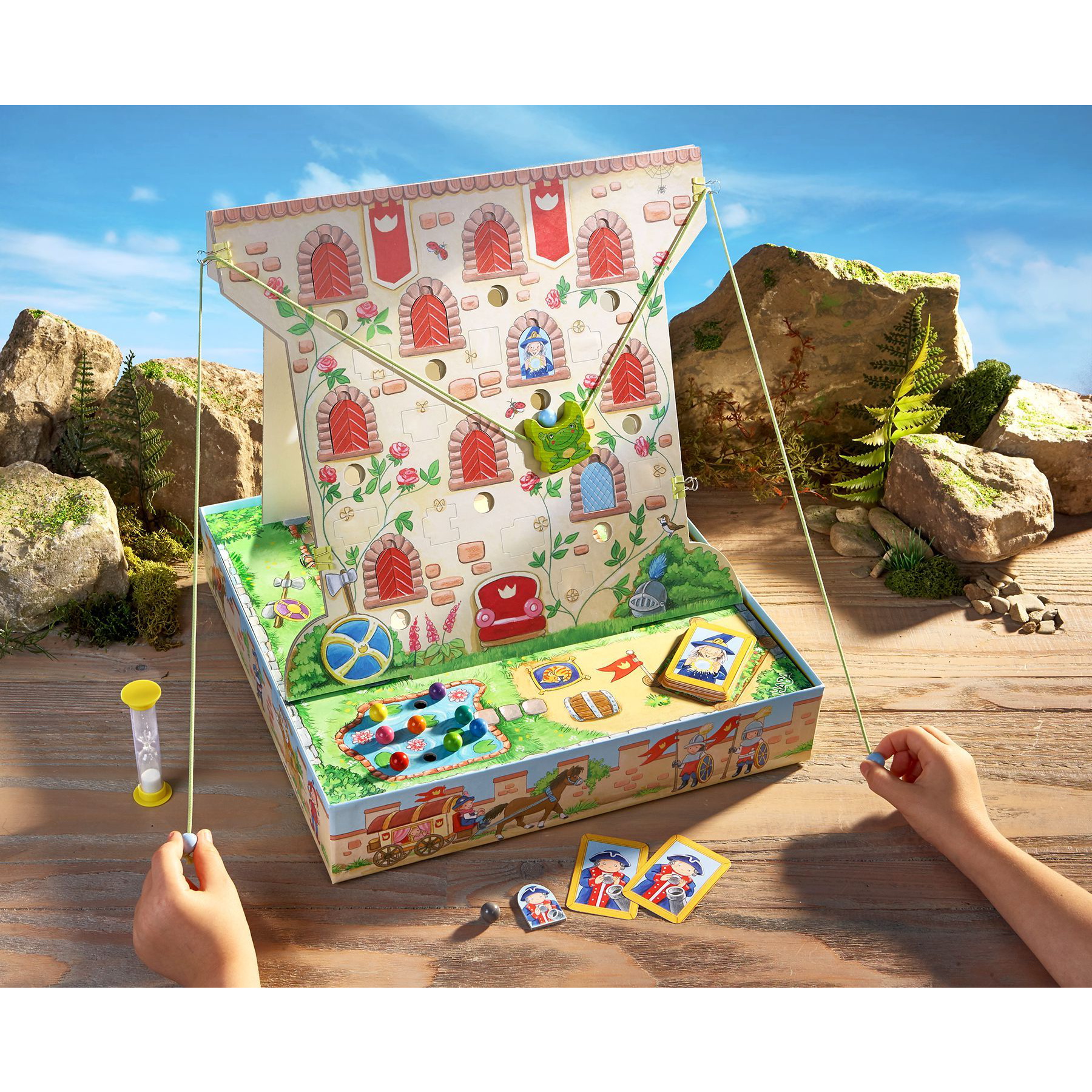 Only Francesco the climbing frog can fetch the items! But he needs help climbing the steep castle tower and tracking down the ball's owner. First, the players open windows to find the right castle resident. Then they help the climbing frog balance the ball up the wall by pulling on the strings — but they need to be careful that the ball doesn't fall into the wrong hole in the wall. The player who uses their skill and memory to return the most balls wins Castle Climbing Frog (Burg Kletterfrosch).