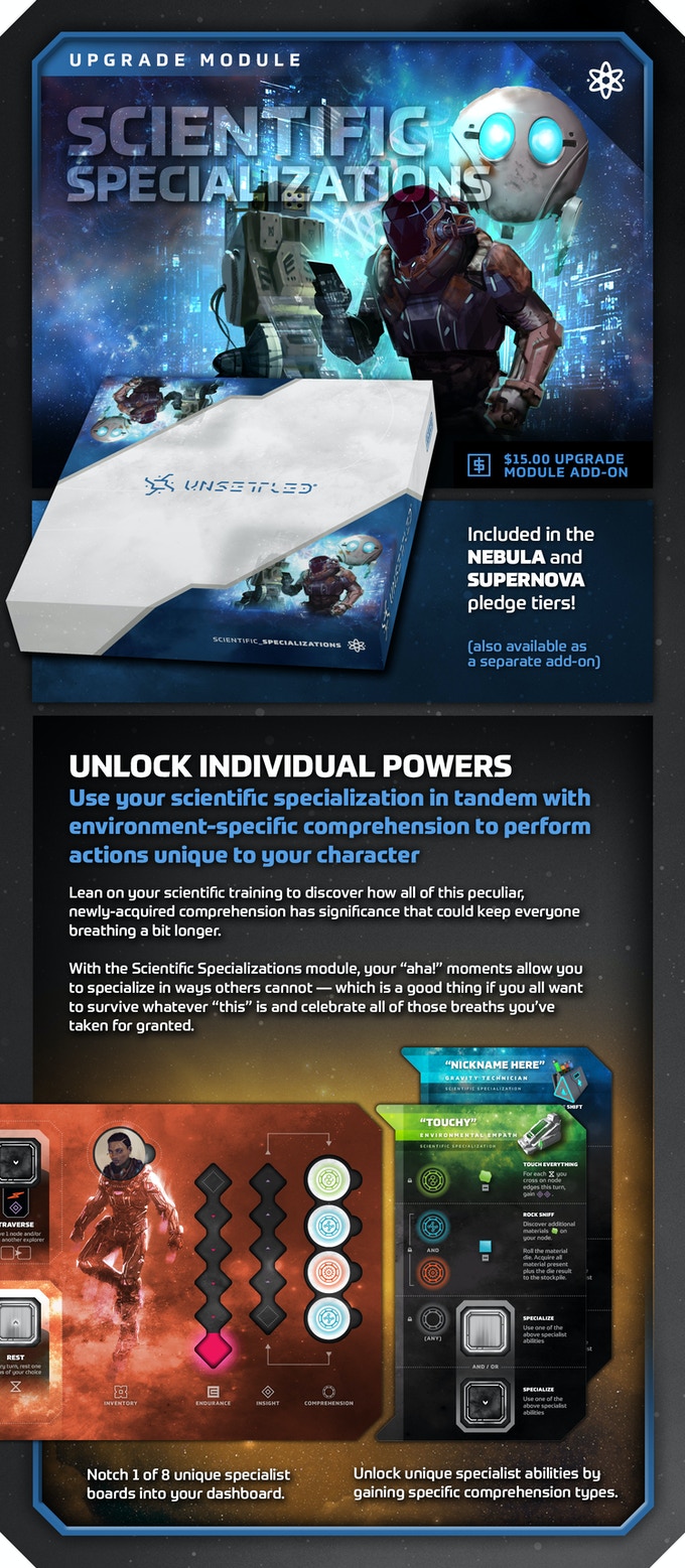 Lean on your scientific training to discover how all of this peculiar, newly-acquired comprehension has significance that could keep everyone breathing a bit longer. With the Scientific Specializations module, your "aha!" moments allow you to specialize in ways others cannot—which is a good thing if you all want to survive whatever "this" is and celebrate all of those breaths you've taken for granted.