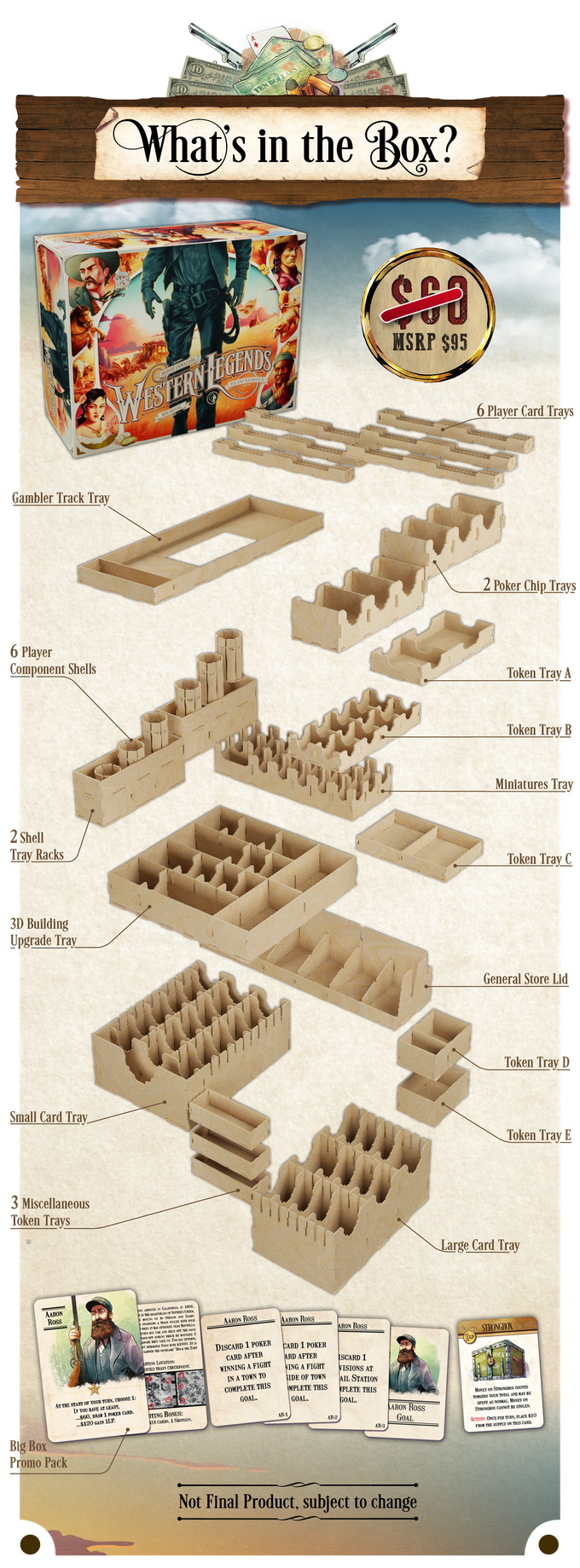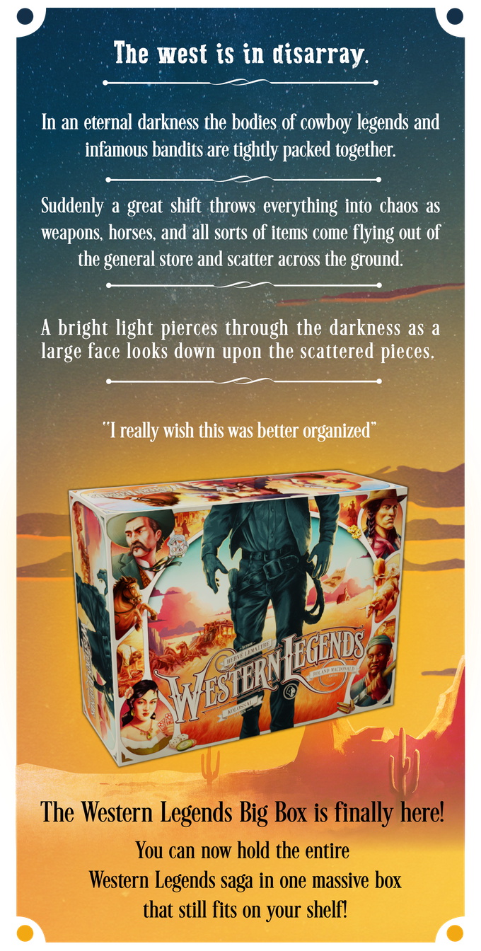 This beautiful box was designed to hold all of your Western Legends content in one place for easy setup.