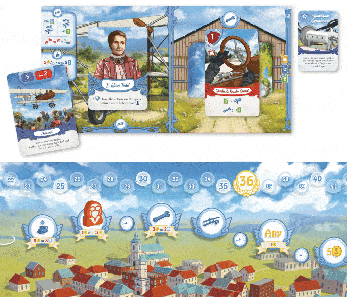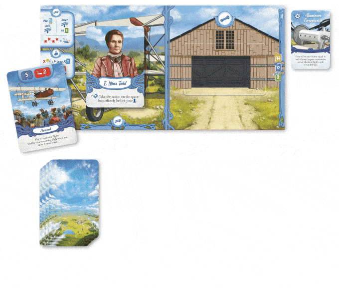 Take actions by moving your pilot pawn to spaces around the game board. The player whose pilot pawn is farthest behind will always take the next action and can move to any available space, so players must strategically balance their priorities with efficiency.