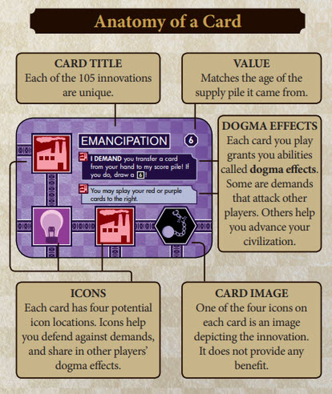 Innovation: Figures in the Sand includes five Decree cards, one for each color. Decrees are a special type of achievement, but unlike all other achievements Decrees are not safe and can be stolen.