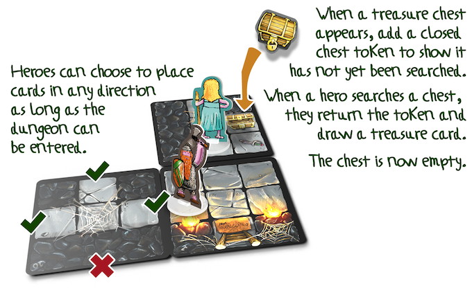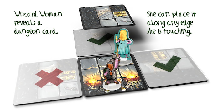 You explore the dungeon by drawing cards from the dungeon deck and placing each card out into the layout. This means every game you play will have its own unique dungeon map - providing a different experience each time.