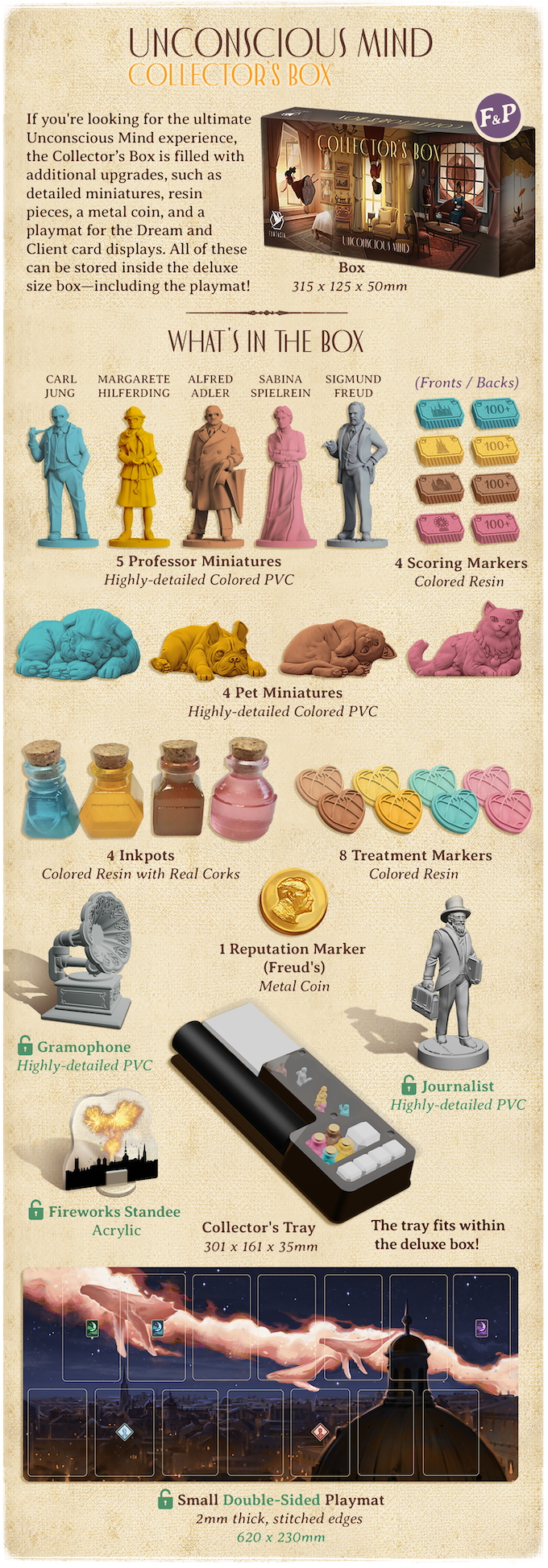 As a member of this society in Unconscious Mind—a game that blends worker placement, engine building, action programming, and multiple rondels—your goal is to master therapeutic techniques, establish a practice, and grow your clientele. By delving into your clients' dreams—their unconscious minds—you can help them reach catharsis and recover from their traumas and layers of grief. As a result, the people you treat will be able to live happier, more productive lives. Alongside that, you can document your discoveries by publishing treatises—which may later be cited by other researchers—to advance your scholarly reputation.