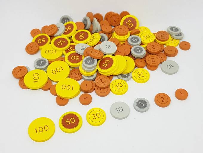 Printed both sides, these tactile wooden tokens come in a cardboard chest with magnetic closure. Each chest contains 150 coins in various denominations (see below).