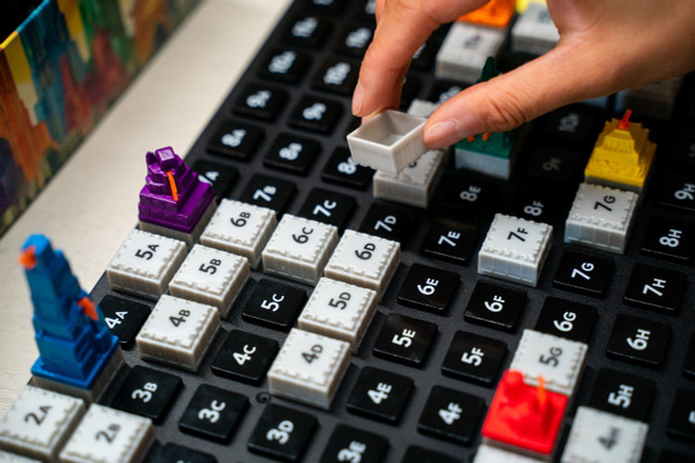 • Plastic board, building tiles, and headquarters! Updated board size, 9x12 space grid with space designations printed on the board.