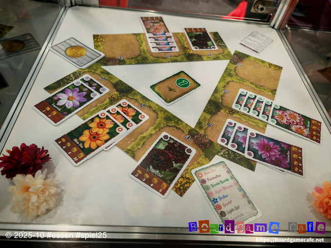 When you harvest flowers, you receive coins based on the number of cards in that field and the "meter" for that particular type of flower. Flip over 1-4 cards from that field to transform them into coins, then place the remainder of the cards in the discard pile. When the deck runs out, shuffle the discards, playing through the deck two more times. At the end of the game, everyone can harvest their fields, then whoever has earned the most coins wins.