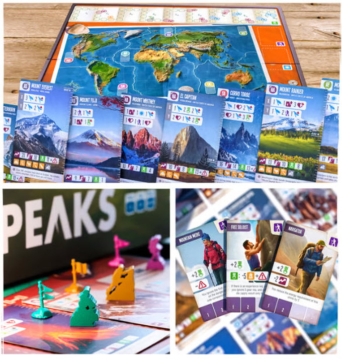 On your turn, choose one of three actions: rest to regain your stamina; prepare to gain mountain passes and equipment; or climb to climb a mountain and reap its rewards. A "tag along" mechanism keeps players engaged even when it's not their turn, adding a collaborative element. Mechanical player mats with moving tiles and dials, a custom die, and flag minis make for a new, tactile experience.
