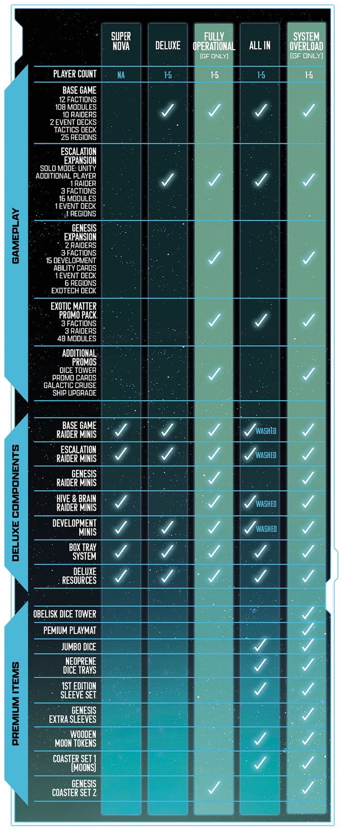 HERE'S A COMPARISON CHART! This explains what is included in Fully Operational vs System Overload. If you have the former deluxe or All In, you can check out what is new. For those who own some gameplay already and are considering Supernova - this is the exact same black box and deluxe pieces, just without the gameplay - it holds it all just like the deluxe editions.