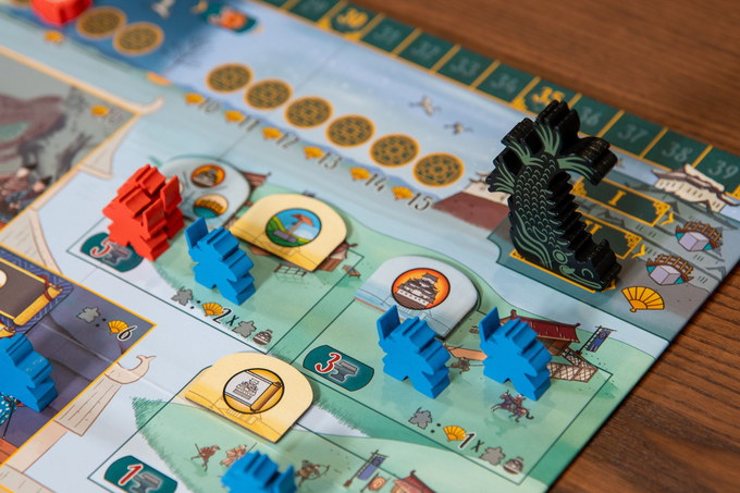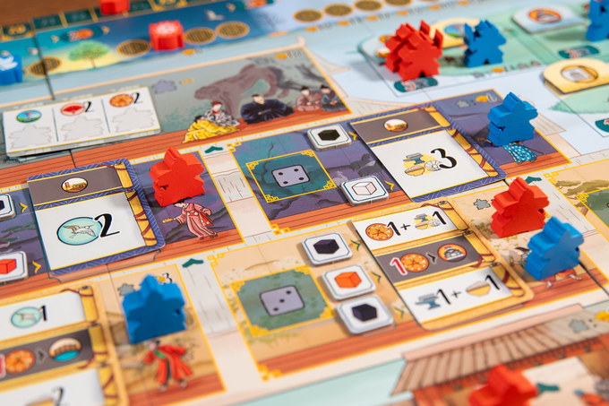 The central panel shows Himeji Castle in all its splendor, divided into several zones. The largest is inside the castle, with the Room of the Thousand Carpets, where the courtiers must ascend socially until they reach the circle closest to the Daimyo to enjoy his favor. There is also the pond and the gardens, patiently tended by the gardeners where everyone can relax and contemplate its beauty without restriction. Another important area is the wall and the outside of the castle, where the warriors patrol and stand guard. Finally, we find the area of the three bridges, where the three types of dice that can be used to carry out actions are accumulated, and the personal domain of each player, where they will keep track of their resources and where they will have the reserve of workers.
