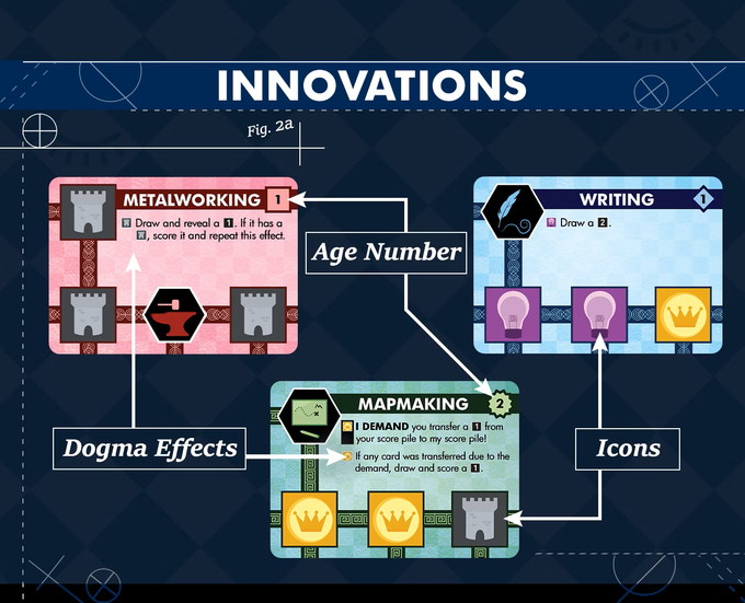Your civilization is represented by the Innovation cards you put into play. There's no map, armies, miniatures or dice to worry about, just the cool ideas your people have developed. Innovation cards are organized into ten eleven decks representing various periods of history. You start in Age 1: Prehistory. Here are some early-age Innovations: