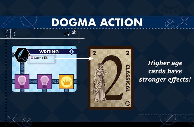 Each Innovation has game text organized into one or more Dogma Effects. When you spend one of your two actions per turn as a Dogma Action, you pick one of your cards to focus on, and perform each of its effects. You're declaring your civilization's intent to focus on that thing: This year, we focus on Writing!