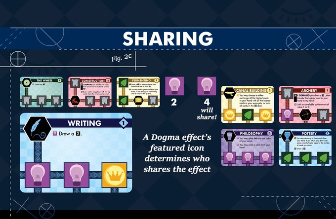 When your people boldly declare a direction, the other civilizations might notice your efforts. In fact, if they're able to, they'll share in your technology's benefits! Eligibility for sharing is determined by the icons you have visible on your board (all of your cards in play). If you have at least as many as an opponent when they take a Dogma Action, you'll perform the effect also. They'll get to draw a free card for sharing, as a bonus.