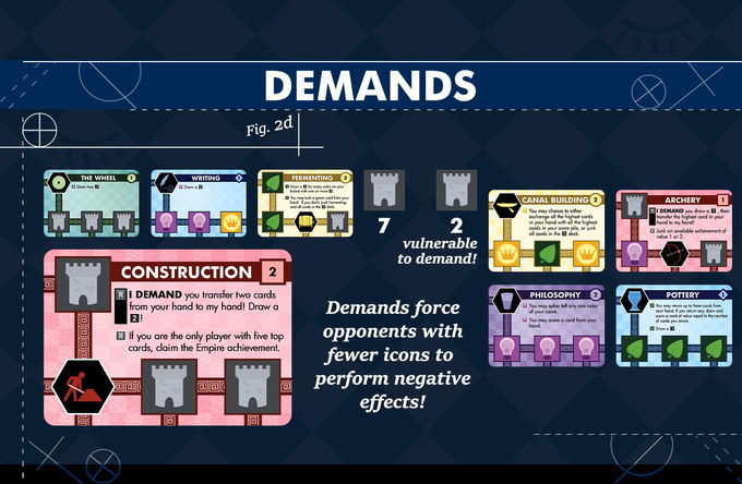 Demands are effects that only impact your opponents, but only if they have fewer icons than you. Their effects can be quite nasty, so watch out! Your ultimate goal is to score points by using effects that place cards in your score pile, and then claim achievements in order to win.