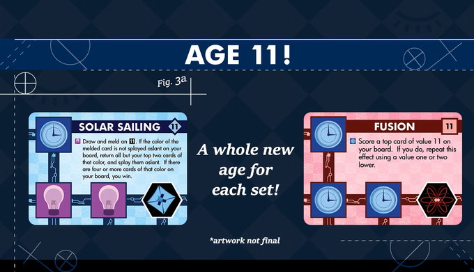 The most important change is that Innovation now goes to 11! The Prudence Age represents both the time since Innovation first released and also speculates deeper into the 21st Century with the things we might (or hope to) think up in the future. Age 11 cards are quite strong, and do a variety of amazing and intriguing things, including the new aslant splay direction: