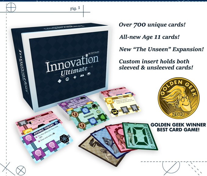 Innovation Ultimate is a box set containing Innovation and all five of its expansions, which includes a brand new expansion titled The Unseen. Many, many updates have been made to this edition. First, Age 11 has been added, representing the recent past and potential near future at the time of release. Lots of language and mechanics have been streamlined, and in particular, the expansions have all been heavily reworked to be more accessible and easy to include while playing.