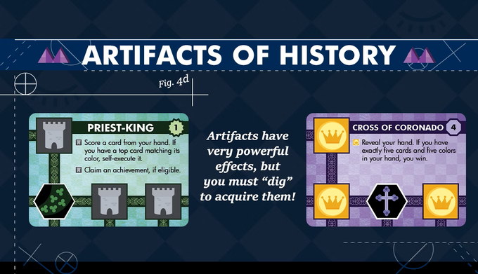 Artifacts of History are wildly powerful items from throughout time, each of which has a powerful Dogma Effect. Once you dig one up, you'll get a chance to use it the next turn before it's placed in a Museum. Be careful - cards in Museums can be stolen by other players, and your powerful effect may wind up in their hands!