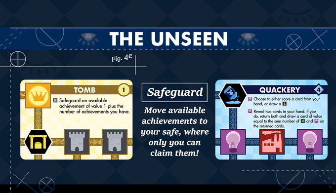 The Unseen is a brand new expansion. The Safeguard mechanic allows you to stash away available achievements in your Safe, where only you can claim them! Cards in The Unseen deal with subterfuge, shadowy technologies, and other clandestine concepts.