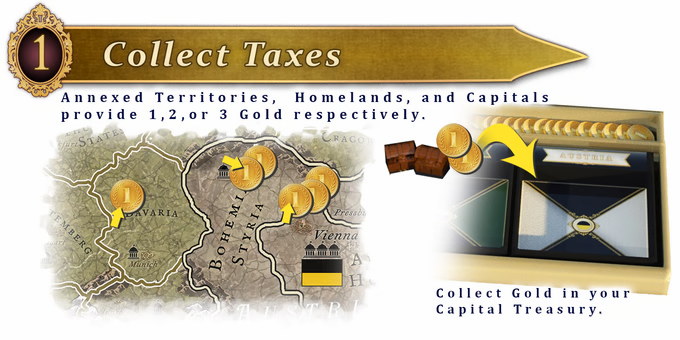 Each Nation collects taxes, in the form of Gold, from its controlled territories.