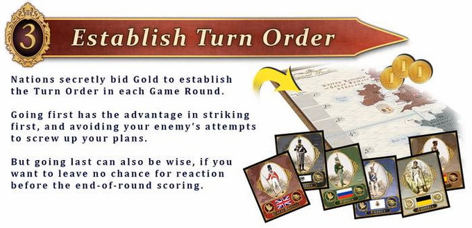 END GAME - Starting in the 5th Game Round, the Congress of Vienna convenes. A blind vote is held as to whether to settle for peace or to continue the conflict. Each subsequent Game Round the results are weighted more heavily towards peace.