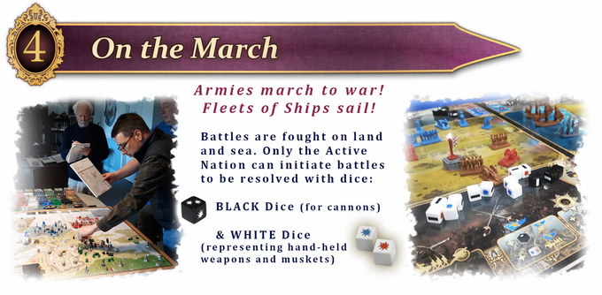 In turn order, each Nation's movement orders are executed. Each battle is resolved by choosing offensive or defensive stances and rolling batches of dice.