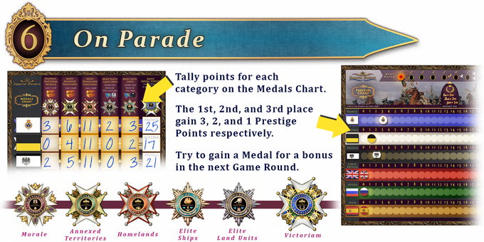 HOW TO WIN - Each Nation's final score is their sum of Prestige points gained gradually over the entire game and the value of all their controlled Territories and Elite Forces in the last Game Round. The highest total score wins the game.
