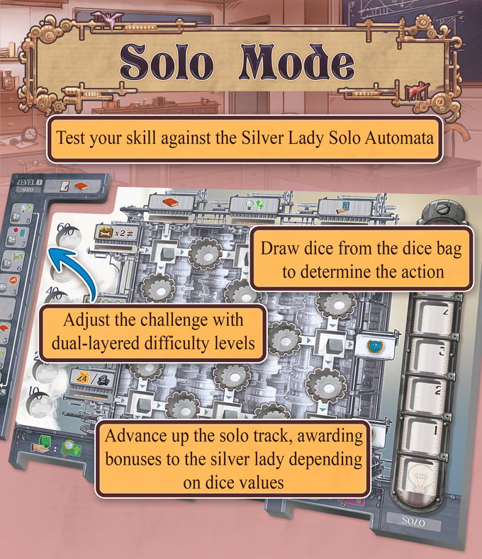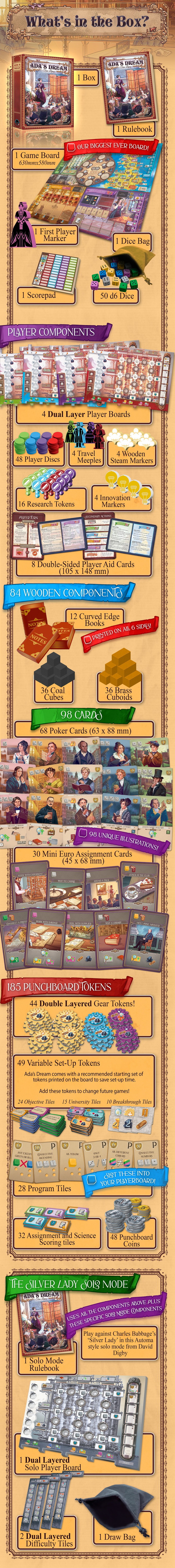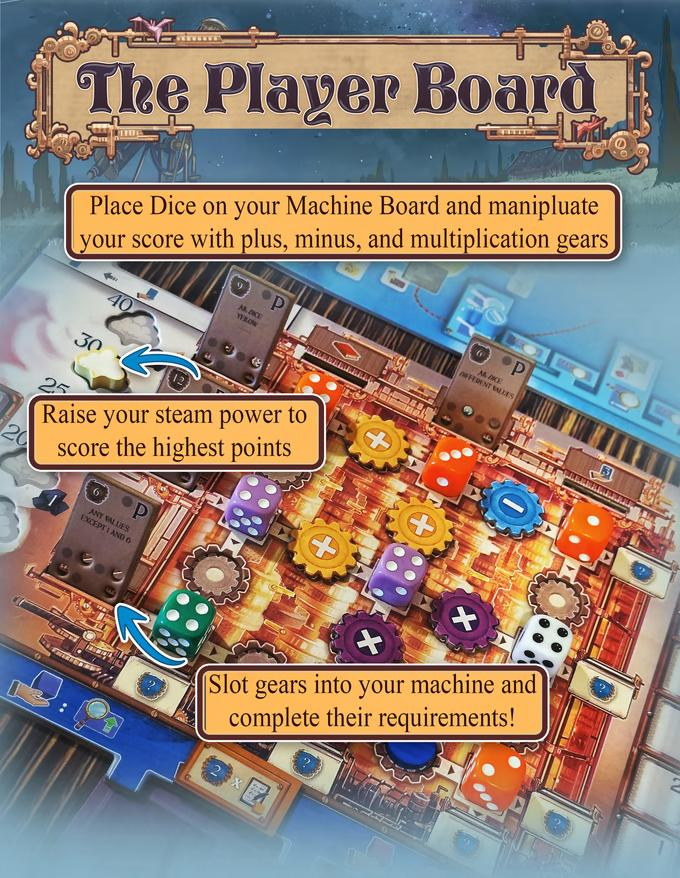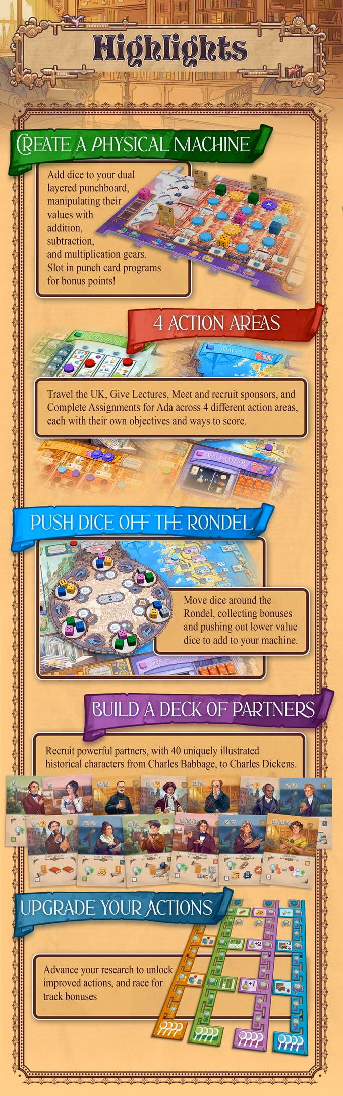 Players add Dice, Gears, and Programs to their blueprint Board to in a race to build the first Analytical Engine, using dice rondel and manipulation mechanics and literal "engine building". When any engine is completed, the end of the game is triggered and Prestige points are counted. The player with the most prestige, wins.