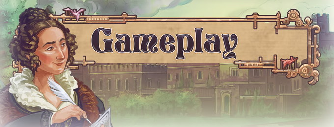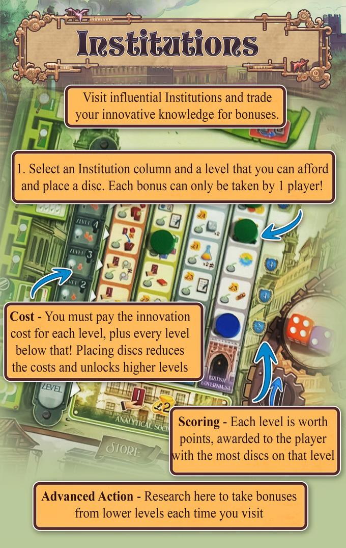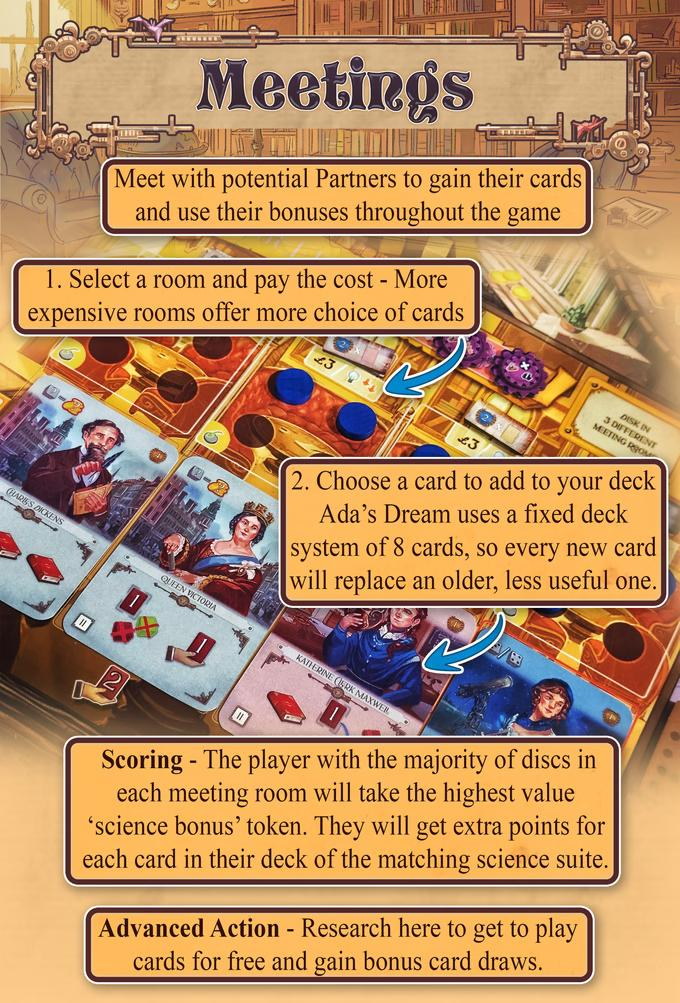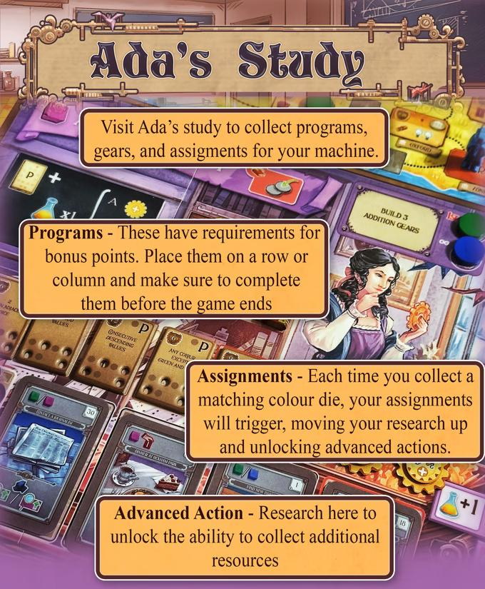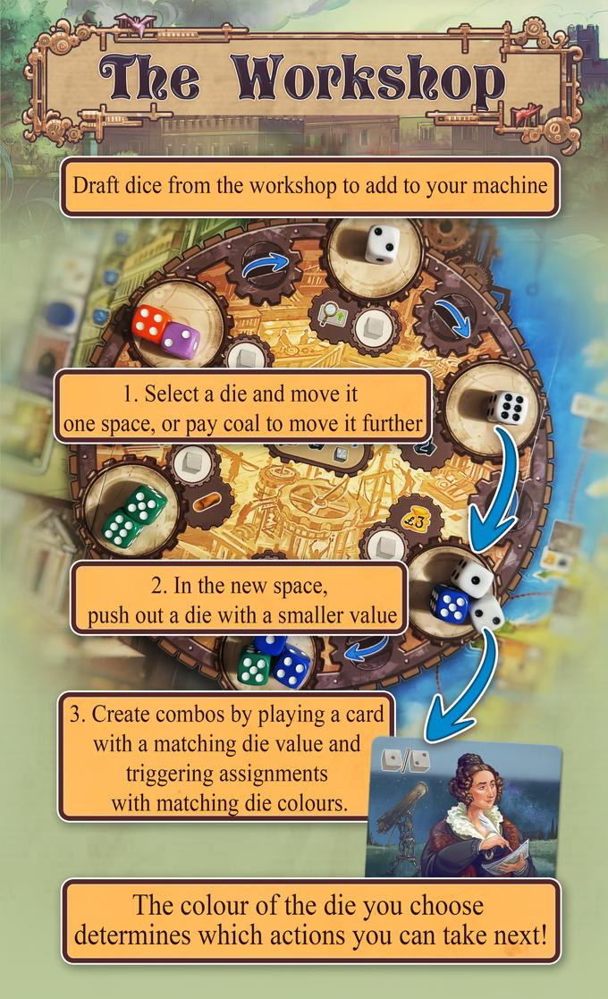 Over the course of the game (18 turns), players take dice from the Workshop Rondel, Give Lectures in Prestigious Institutions, Travel the UK, and Complete Assignments from Ada to gather Prestige Points.
