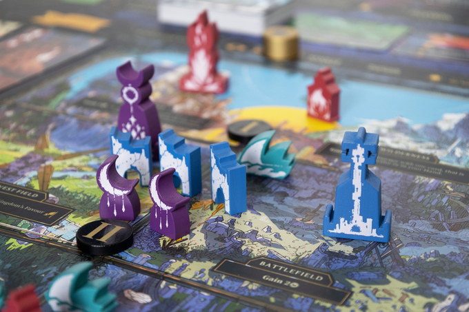 In The Old King's Crown, players move their Herald to locations, hoping to claim them. Then simultaneously players play cards from their hand, facedown to regions of the board. These are then revealed and resolved. Winning these clashes will result in different rewards that further their position and grant them the game's primary goal, influence. The player with the most influence by the end of a set number of rounds will be declared the winner.