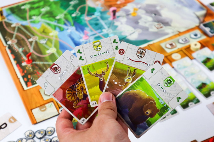 The main board represents the wildlife reserve, dominated by a towering mountain divided into distinct regions. Using a "reverse-drafting" mechanic, where each player assigns their cards to others, rangers will acquire the tools they need to explore the mountain via different paths and transportation systems.
