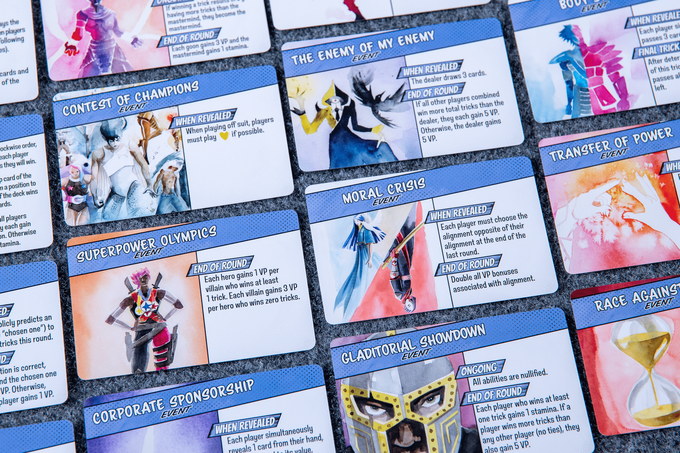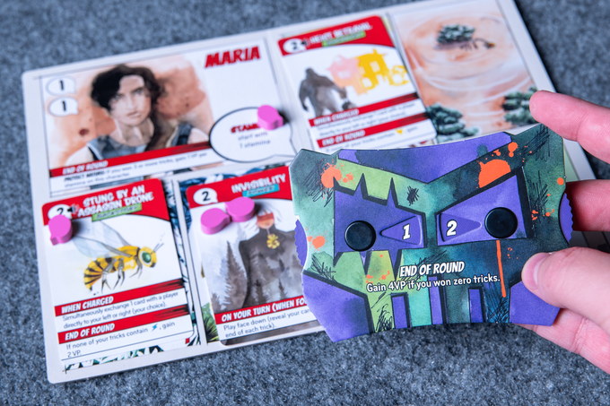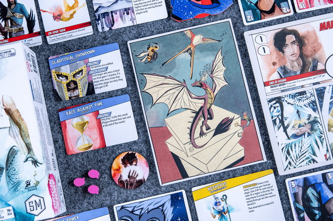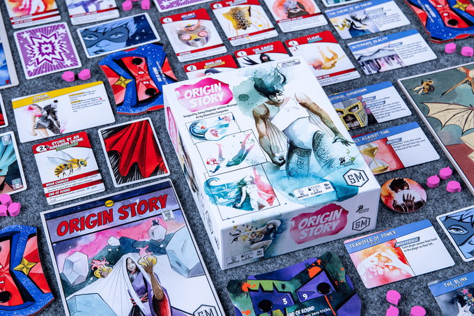 Origin Story is a 1-5 player competitive tableau-building, trick-taking game played over 5 rounds. Each round represents a chapter in your development and grants a new card to add to your player mat. Charge your cards and use their abilities to score more points than your opponents.
