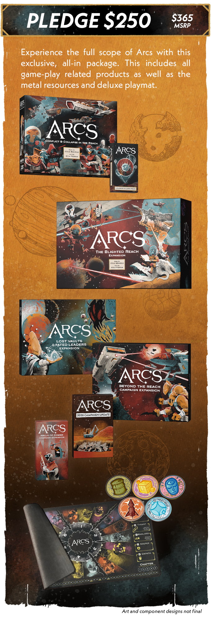 Experience the full scope of ARCS with this exclusive, all-in package. This includes all game-play related products as well as the metal resources and deluxe playmat.