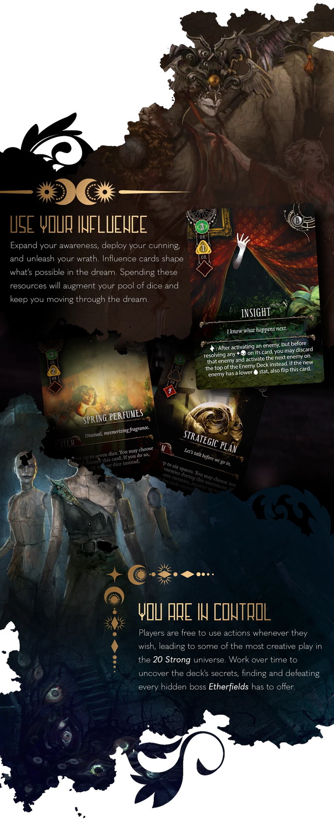 Expand your awareness, deploy your cunning, and unleash your wrath. Influence cards shape what’s possible in the dream. Spending these resources will augment your pool of dice and keep you moving through the dream. Players are free to use actions whenever they wish, leading to some of the most creative play in the 20 Strong universe. Work over time to uncover the deck’s secrets, finding and defeating every hidden boss Etherfields has to offer.wn objectives. Their choices might even require you not to make it off the ship alive. Focus on your survival and make sure you’re in one of those escape pods!