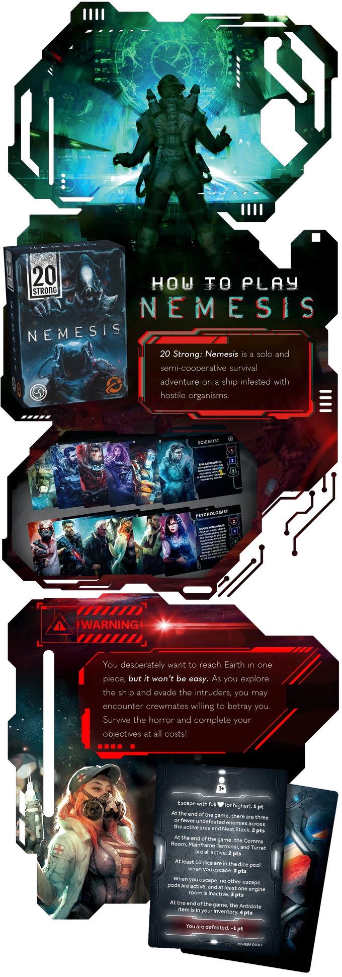 In 20 Strong: Nemesis, you desperately want to reach Earth in one piece, but it won’t be easy. As you explore the ship and evade the intruders, you may encounter crewmates willing to betray you. Roll dice to move throughout the ship. Discover critical functions like generators, engines, and escape pods. The longer you take, the more noise you’ll make.